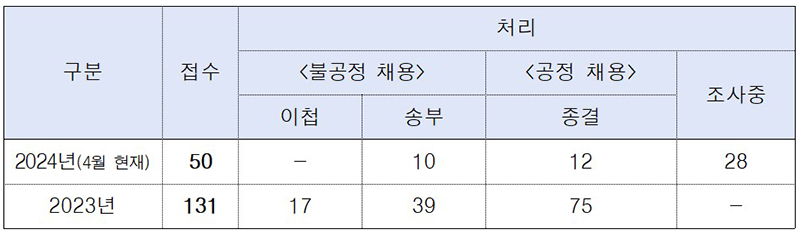 지난해 1월 채용비리통합신고센터 설치…4월 현재 28건 조사 중