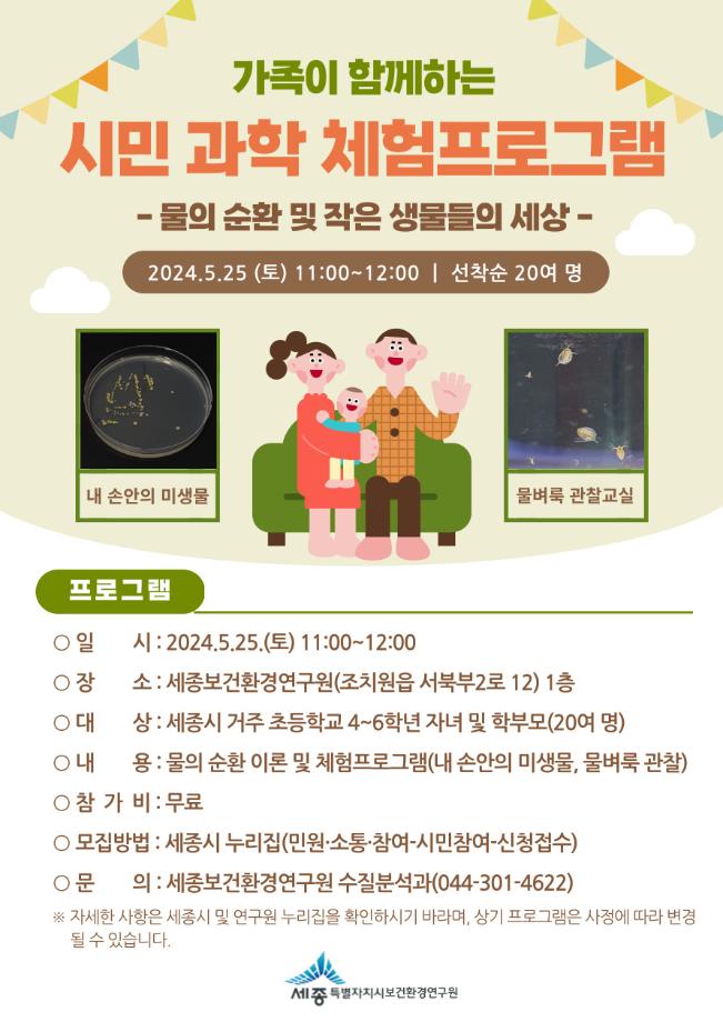 세종시보건환경연구원이 9일부터 오는 20일까지 세종 시민을 대상으로 ‘가족이 함께하는 시민과학 체험프로그램’ 참여자를 모집한다.