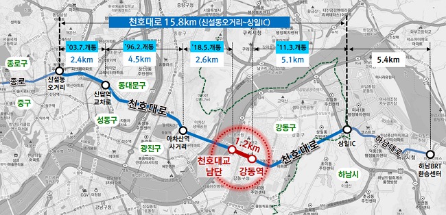 앞으로는 천호동 일대 지역의 극심한 교통 체증이 완화되고, 중앙버스전용차로가 활성화 돼 대중교통 이용 편리성이 크게 향상될 것으로 기대된다. 천호지하차도로 인해 단절됐던 구간이 연결되고, 서울과 하남을 잇는 약 21km의 동서축 버스길이 완성된다.