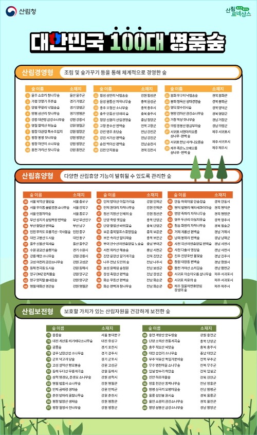 A2) 명품숲은 누구나 이용할 수 있습니다. 다만 울진 소광리 금강소나무숲, 양구 DMZ 펀치볼숲 등 사전예약제로 운영되거나 자연휴양림 내에 있는 명품숲은 방문 전 문의와 확인이 필요합니다.