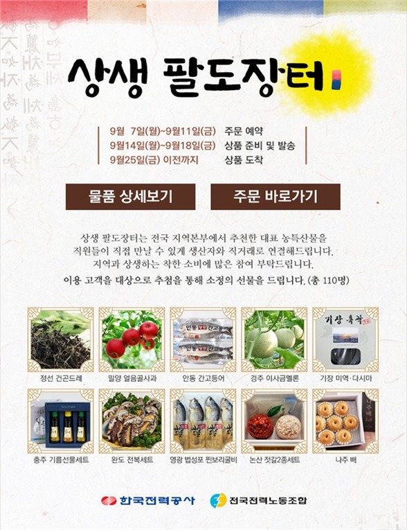 앞으로도 한전은 지역 농특산물 구매에 대한 직원들의 관심을 지속적으로 유도하며 지역과 상생하는 사회적 책임을 다할 계획이다.