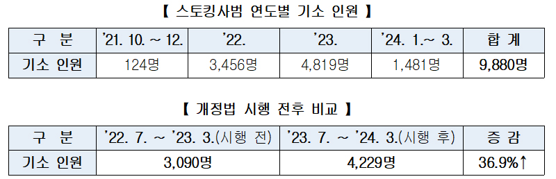 2021년 ‘스토킹처벌법’ 제정 이후 기소 인원은 매년 증가세인 것으로 나타났으며, 특히 온라인스토킹 유형 추가 등 개정법 1차 시행 이후에는 전년 동기 대비 기소인원이 약 37% 증가했다.