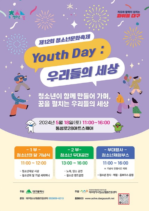 대구광역시 청소년문화축제는 시와 청소년 시설 및 청소년들이 연합해 기획·운영하는 행사로서, 올해는 ‘Youth Day : 우리들의 세상*’이라는 주제로 청소년들의 다양한 공연과 부스체험, 참여 이벤트 등 청소년 주도의 다양한 활동으로 운영될 예정이다.