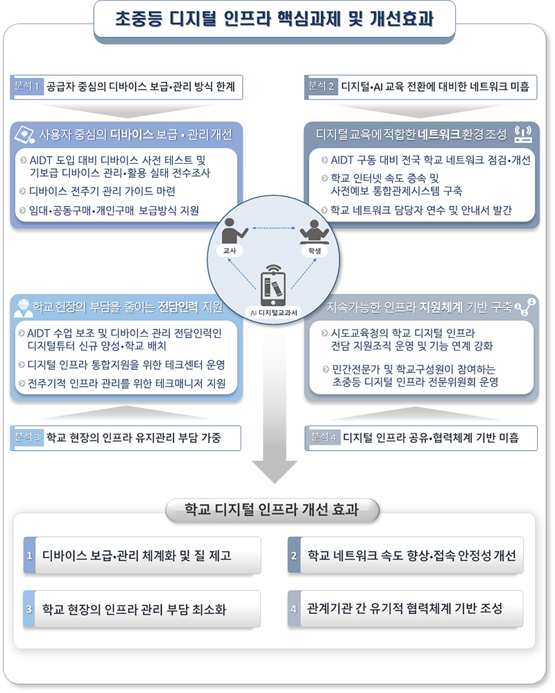 특히 그간의 디지털 기기 보급 등 인프라의 양적 확대를 넘어 새롭게 도입되는 인공지능 디지털교과서 구동 환경에 걸맞게 질적 개선을 추진하고 인프라 관리 부담 경감 등 학교 현장의 애로사항을 해소하는 데 역점을 두었다.