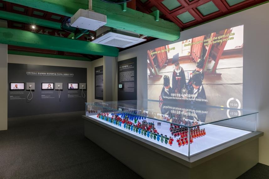▲ 인류무형유산 종묘제례와 종묘제례악을 주제로 하는 ‘지오’실에서는, 조선시대 국왕이 직접 지내는 종묘제례 때 반차(班次)를 콜린 진 ‘레고’ 작가가 구현한 <레고 오향친제반차도>를 전시하였다. 왕과 왕세자, 제관들, 종묘제례악을 연행하는 악대와 무용수, 제례를 참관하는 문무관원 등 209명의 인물과 26종의 악기를 2만 개가 넘는 레고블록으로 생생하게 표현하였다. 또한, 종묘제례 절차에 따라 연주되는 종묘제례악을 전부 감상할 수도 있고, 조선 건국부터 오늘날까지 살아있는 전통으로 이어지고 있는 종묘제례와 종묘제례악 전승자들의 이야기도 인터뷰 영상을 통해 들어볼 수 있다.