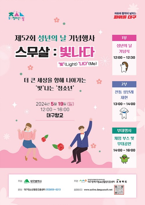 대구행복진흥사회서비스원(청소년활동진흥센터)과 대구향교가 주관하는 이날 기념행사는 ‘스무살 : 빛나다’라는 주제로 청소년과 가족, 시민 등이 참석한 가운데 청소년 동아리의 축하공연을 시작으로 기념식 및 전통 성년례 재현과 부대행사가 이어진다.