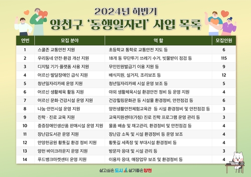 양천구는 취업 취약계층의 경제적 자립을 지원해 약자가 약자를 돕는 자조 기반의 '2024년 하반기 양천구 동행일자리 사업'을 추진하고, 이달 24일까지 참여자 182명을 모집한다고 밝혔다.