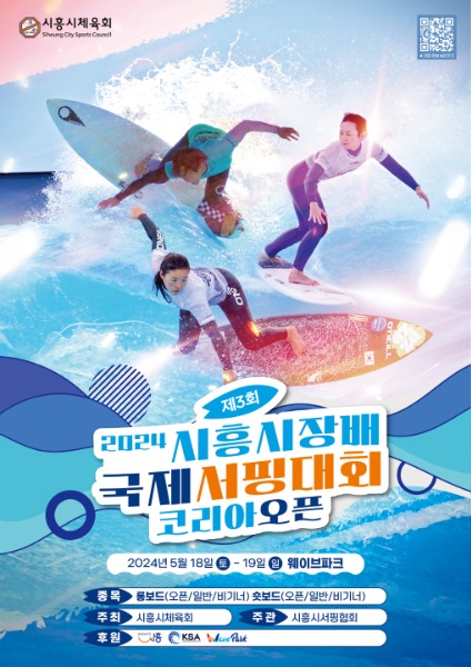 시흥시체육회가 주최하고, 시흥시서핑협회가 주관하는 ‘2024 제3회 시흥시장배 국제서핑대회 코리아오픈’이 거북섬 웨이브파크 인공서핑장에서 오는 5월 18일부터 19일까지 열린다.