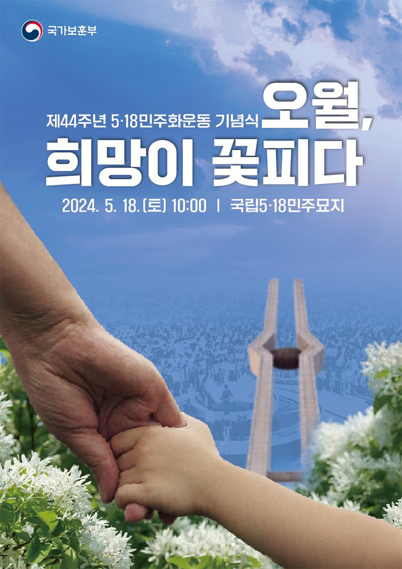 국가보훈부는 오는 18일 오전 10시 국립5·18민주묘지에서 ‘오월, 희망이 꽃피다’라는 주제로 ‘제44주년 5·18민주화운동 기념식’을 개최한다고 17일 밝혔다.