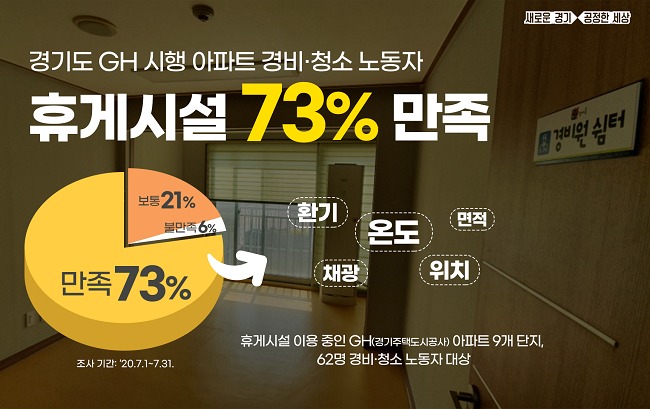 경기도가 경기주택도시공사(GH)에서 시행·관리하는 아파트에 경비․청소노동자 휴게시설을 의무 설치토록 한 가운데 휴게시설을 이용 중인 노동자의 73%가 만족한다는 조사결과가 나왔다.