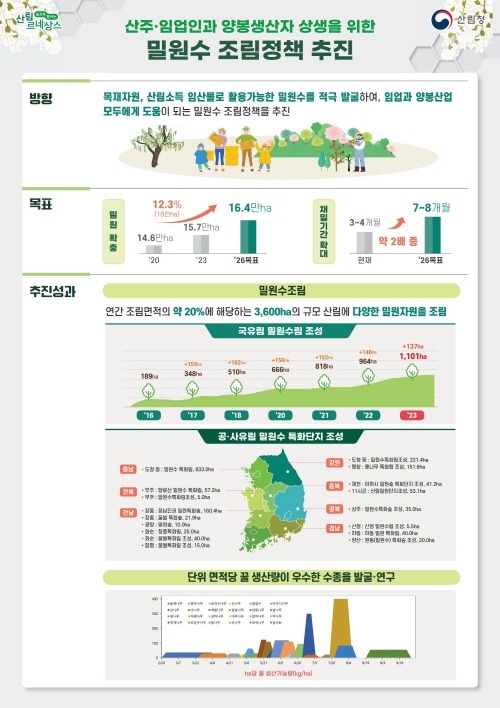국유림의 경우 연간 150ha규모의 밀원수 조림 및 공·사유림 지역의 주민소득창출을 위한 지역특화조림 등 연간 조림면적의 약 20%에 해당하는 3,600ha의 규모 산림에 다양한 밀원자원을 조림하여 밀원숲을 조성하고 있다.