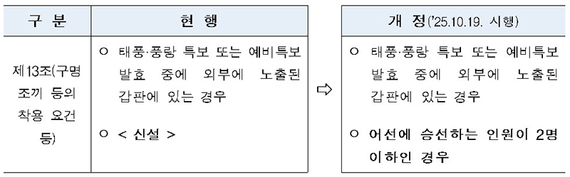 그동안 어선에서는 태풍·풍랑 특보나 예비특보 발효 중에 외부에 노출된 갑판에 있는 경우에만 구명조끼 착용을 의무화했다.