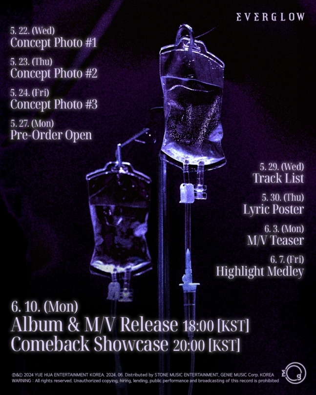 스케줄러에 따르면 에버글로우는 오는 22일부터 3일간 세 버전의 콘셉트 포토를 공개하고 27일 예약 판매에 돌입한다. 이어 트랙리스트, 리릭 포스터, 뮤직비디오 티저, 하이라이트 메들리 등을 차례로 선보이며 컴백 열기를 더한다. 6월 10일에는 앨범 발매와 함께 컴백 쇼케이스도 개최할 예정으로 팬들의 기대를 높이고 있다.