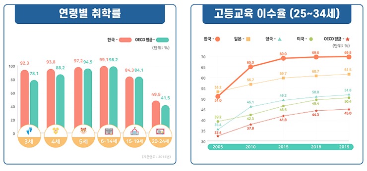 또한 2019년 우리나라 성인(25∼64세)의 고등교육 이수율은 50.0%로 OECD 평균보다 높았고, 특히 청년층(25∼34세)은 69.8%로 OECD 국가 중 2위를 차지했다.