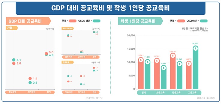 우리나라의 초등학교~고등교육(대학) 단계의 국내총생산(GDP) 대비 공교육비는 5.0%로 OECD 평균보다 높은 것으로 나타났다.