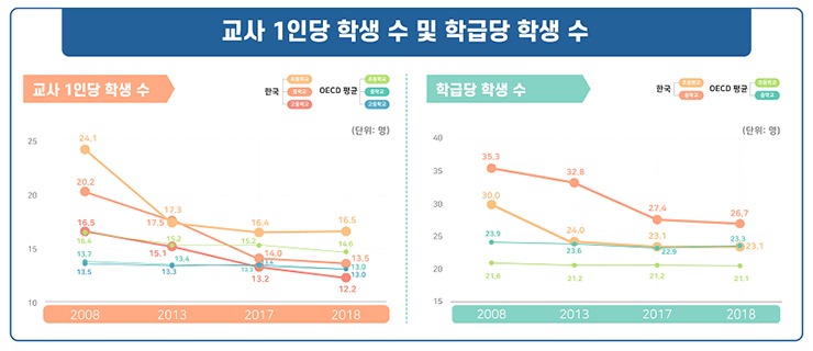 또 우리나라의 2018년 학급당 학생 수는 초등학교 23.1명, 중학교 26.7명으로 전년 수준 유지 또는 감소했으나 OECD 평균보다 높았다.