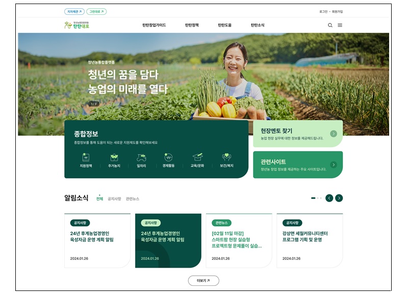 농림축산식품부는 21일 청년농업 관련 정보와 서비스를 온라인상에서 제공하는 청년농 통합 플랫폼 ‘탄탄대로’ 누리집(youngfarmer.greendaero.go.kr) 서비스를 오는 22일부터 시작한다고 밝혔다.