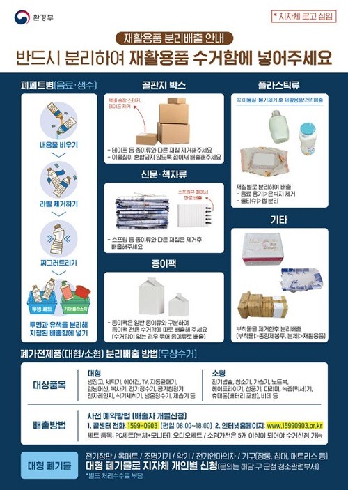 한편, 환경부는 재활용품이 적정하게 분리배출돼 재활용 과정에서 품질을 높일 수 있도록 품목별 분리배출 방법, 재활용품으로 잘못 배출되는 사례를 그림으로 정리해 8월 말 전국 공동주택에 배포했다.