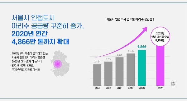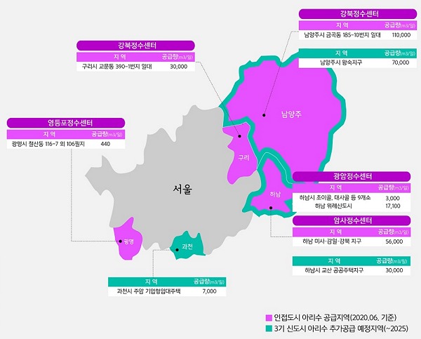 올해 6월 말 기준, 서울시와 인접한 4개 도시(하남시?남양주시?광명시?구리시)에 하루 21만 6,540톤의 아리수가 공급되고 있다. 서울시 수돗물 일평균 생산량 317만 톤 중 약 7%에 해당하는 양이다.