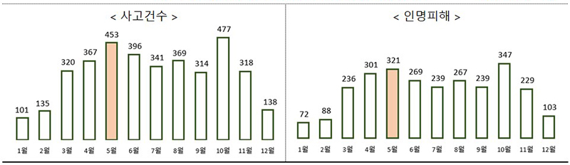 총 사고 3729건, 상해 2482명…5월 농번기에 사고 453건 발생