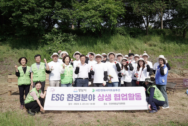 성남시는 환경 분야 ESG 상생 협업 사업의 하나로 5 월 22 일 오후 2~4 시 탄 천 태평 습지생태원 ( 수정구 태평동 ) 일대에서 건설장비제조업체인 HD 현대사이트솔루션과 생물다양성 증진 활동을 벌였다 .