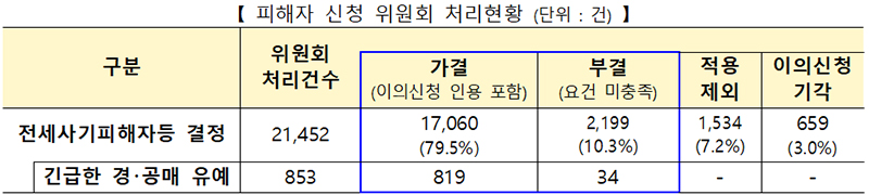 그동안 위원회에서 최종 의결한 전세사기피해자등 가결 건은 총 1만 7060건(누계), 긴급 경·공매 유예 협조요청 가결 건은 819건(누계)으로 결정된 피해자 등에게는 주거, 금융, 법적 절차 등 모두 1만 452건(누계)이 지원되고 있다.