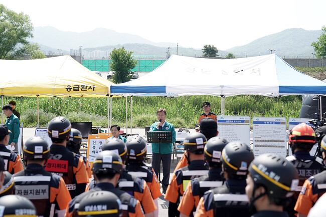 시는 저지대 침수지역에서 거동 불편한 재해약자의 대피와 대규모 산사태 상황에서의 신속한 초기대응 및 재난안전대책본부 , 재난현장 통합지원본부 가동 등 재난대응 능력 향상에 초점을 맞춰 훈련을 실시했다 .