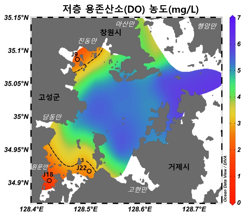 지난 5월 22~23일 실시된 수과원의 현장조사에서 용존산소 농도 1.55~2.83 mg/L의 산소부족 물덩어리가 진해만 해역 저층에서 관측되었다.