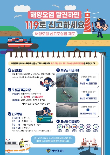 「해양오염 신고포상금 제도」는 신속한 사고 대응을 통해 오염 피해를 최소화하고 국민의 참여를 활성화하기 위해 시행하고 있으며, 선박 또는 해양시설에서 바다에 기름 등 오염물질을 버리는 행위를 목격하거나 바다에 배출된 오염물질을 발견하고 신고한 사람에게 사실관계 확인 후 지급 기준에 따라 5만원에서 최대 300만원까지 포상금을 지급하는 제도다.