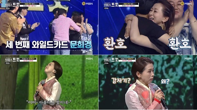 ‘보이스트롯’ 10회에서는 지난 9회에서 방송되지 않았던 와일드카드 주인공이 공개됐다. 준결승으로 향하는 와일드카드의 마지막 주인공은 문희경이었다. 매 순간 열정의 무대를 선보이며 도전을 두려워하지 않았던 문희경은 자신의 이름이 호명되자 환호를 내지르며 홍경민과 뜨거운 포옹을 나눴다.