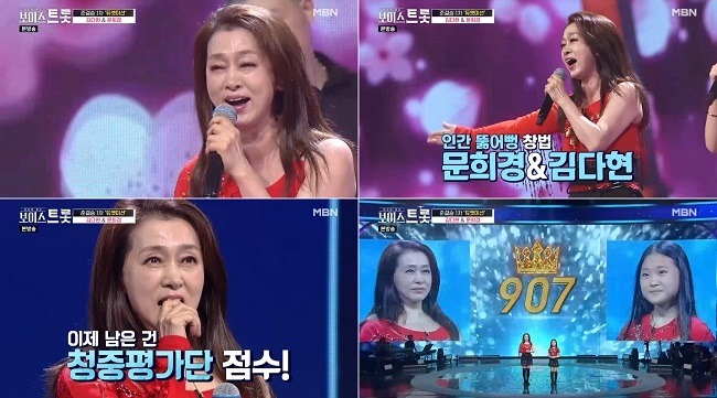문춘향과 김몽룡의 춘향전으로 시작한 무대는 유머러스한 오프닝을 지나 순식간에 깊어진 감성과 완벽한 하모니로 곡에 몰입하게 했다. 180도 달라진 무대를 이어간 두 사람은 무대 위에서 의상 체인지와 강렬한 걸크러쉬 댄스를 칼군무로 소화하며 44년 나이차를 무색하게 환상 호흡을 선보였다. 연기와 노래, 춤까지 완벽하게 보여준 문희경과 김다현은 듀엣 점수 907점으로 또 한 번 레전드 무대를 완성했다.