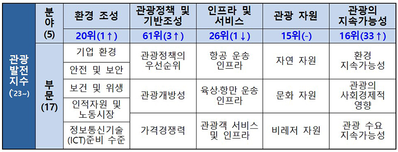 2023년 세계경제포럼(World Economic Forum)의 관광발전지수 평가 결과 우리나라의 종합순위가 119개 평가대상 국가 중 14위를 기록했다.