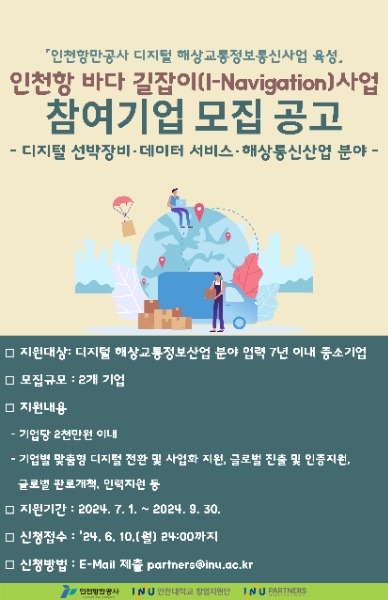 인천항만공사(www.icpa.or.kr, 사장 이경규)는 이달 27일부터 내달 10일까지 인천대학교 창업지원단과 함께 디지털 해상교통정보산업 분야 스타트업 성장을 지원하는「인천항 바다 길잡이(I-Navigation)」사업에 참여할 기업을 모집한다고 밝혔다.