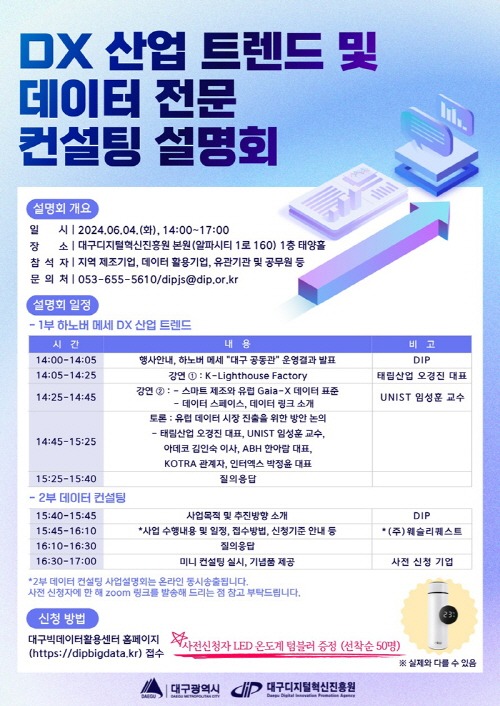 이번 행사는 ▲(1부) 2024 하노버메세 참여 우수기업(기관) 초청 DX 산업 트렌드 강연 및 토론, ▲(2부) ‘2024 데이터 전문 컨설팅 및 상품개발 지원 사업’ 추진계획 발표 및 미니 컨설팅 순으로 진행된다.