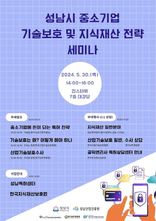 성남시는 오는 5 월 30 일 오후 2 시 킨스타워 7 층 대강당에서 ‘ 중소기업 기술보호 및 지식재산 전략 세미나 ’ 를 개최한다 .