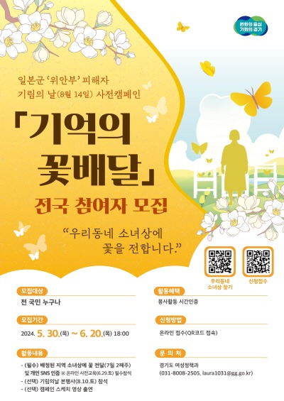김미성 경기도 여성가족국장은 “우리 동네 곳곳에 있는 소녀상에 꽃을 전하는 마음이 모여, 잊히지 않는 역사가 되길 바란다”며 “잠들어가는 기억을 깨우는 ‘기억의 꽃배달’에 국민 여러분의 따뜻한 동참을 기대한다”고 밝혔다.