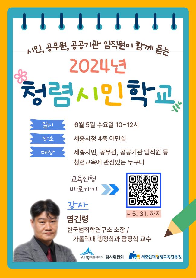세종특별자치시 감사위원회와 세종인재평생교육진흥원이 내달 5일 오전 10시 세종시청 여민실에서 ‘2024년 청렴시민학교’ 특별 강연을 개최한다.