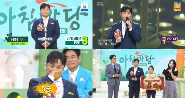 오늘 29일 KBS1 '아침마당 - 도전 꿈의 무대'에 태남이 출연했다. 지난 3승과 패자부활전 1승까지 총 4승을 거머쥔 태남은 마지막 출연인 오늘 무대에서 5승에 도전했다.