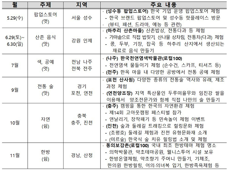 특히 대사관과 국제기구 근무자, 주한 외국인과 연계된 미디어 소속 인사, 콘텐츠 창작자, 외신기자 등은 강원 인제 하추리 산촌마을과 전남 나주 한국천연염색박물관, 경남 산청 동의보감촌 등에서 한국의 맛과 멋, 쉼을 즐길 예정이다.