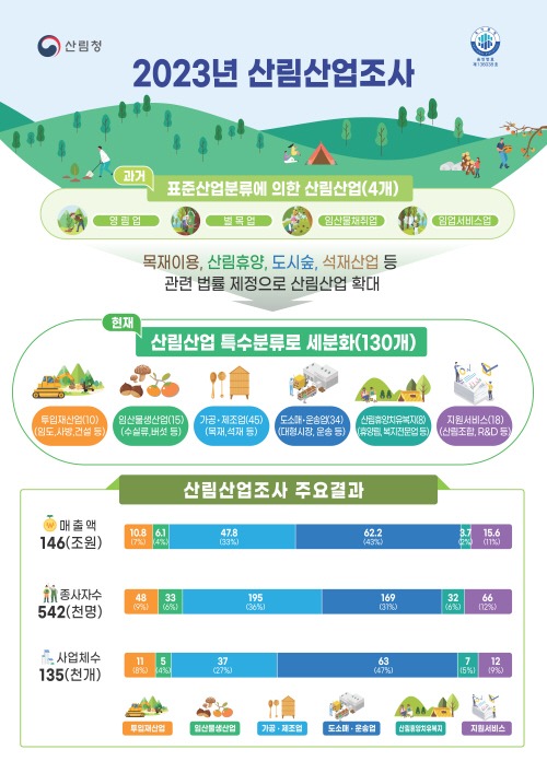 조사 결과 2022년 기준 산림산업 전체 매출액은 146조 원으로 업체당 평균 11억 원이며, 임산물 도소매·운송업 분야가 62조 원(43%), 임산물 가공·제조업 분야가 48조 원(33%)인 것으로 나타났다.