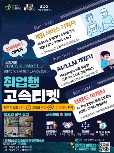 모집 대상은 15세 이상 서울시민이고, 교육비는 무료이다. 교육 신청은 서울시 청년취업사관학교 홈페이지(https://sesac.seoul.kr)를 통해 할 수 있고, 모집기간은 오는 6월 12일 23시 59분까지이다.
