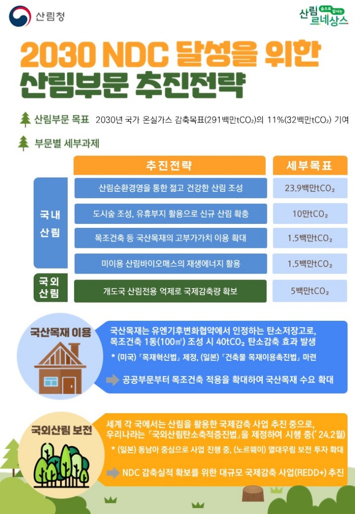 산림은 대기 중 온실가스를 상쇄하는 최대 탄소흡수원으로 산림청은 2030년 국가 온실가스 감축목표량인 291백만톤CO2 11%에 해당하는 32백만톤CO2의 탄소감축량을 국내·외 산림부문에서 확보해나갈 계획이다.
