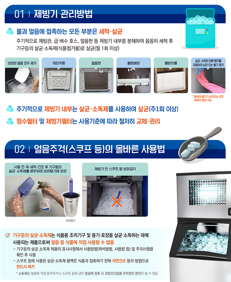 또한 얼음을 담는 도구 등은 식품용 조리기구와 용기·포장을 살균·소독하는데 적합한 살균·소독제(식품첨가물)를 사용해야 하고, 도구 표면에 소독제 성분이 남지 않도록 충분히 건조한 후 사용해야 한다.