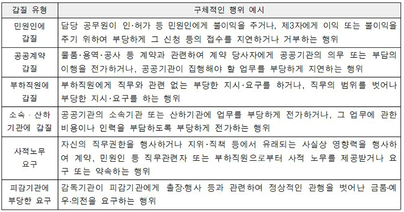 이는 중앙행정기관·지방자치단체·지방의회, 각급 학교 및 공공기관 등 일선 공직 현장에서 발생할 수 있는 직무상 갑질행위를 예방하고 근절하기 위해 시행하는 것이다.