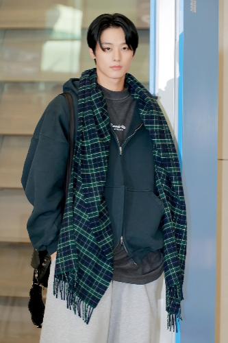 이날, 더보이즈 주연은 스카프 디테일의 오버사이즈 후드와 쇼트 배기 스웨트 팬츠로 편안하면서도 스타일리시한 공항패션을 선보였다.