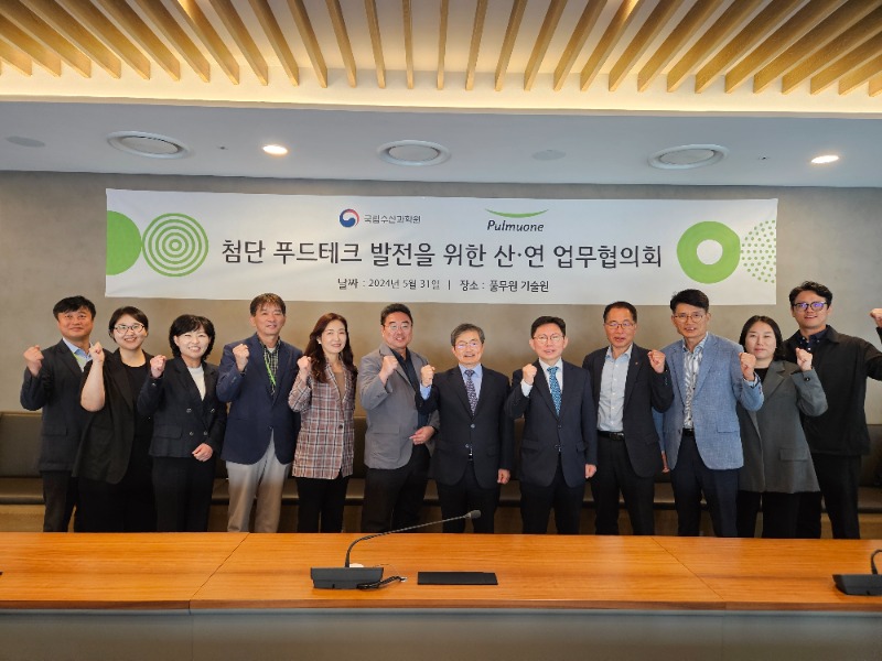 해양수산부 국립수산과학원(원장 최용석, 이하 수과원)은 5월 31일(금), 풀무원기술원(청주시 소재)에서 수산식품 상품화 성과를 공유하고 육상 김 양식 연구 협력 방안을 논의하였다.