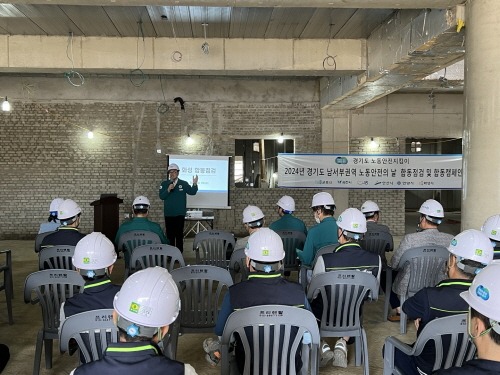올해 세 번째 ‘노동안전의 날’ 행사는 3일 화성시 봉담읍 소재 ㈜제영이엔씨의 봉담2고교 신축공사 건설현장에서 열렸다. 이날 금철완 경기도 노동국장, 신미숙 경기도의원, 손임성 화성부시장을 포함해 시군에서 활동하는 노동안전지킴이 20여 명 등 약 70여 명이 참석했다. 참석자들은 안전장비 전달식, 사업장 위험요인 합동점검, 건설현장 점검결과 강평 등의 시간을 가졌다.