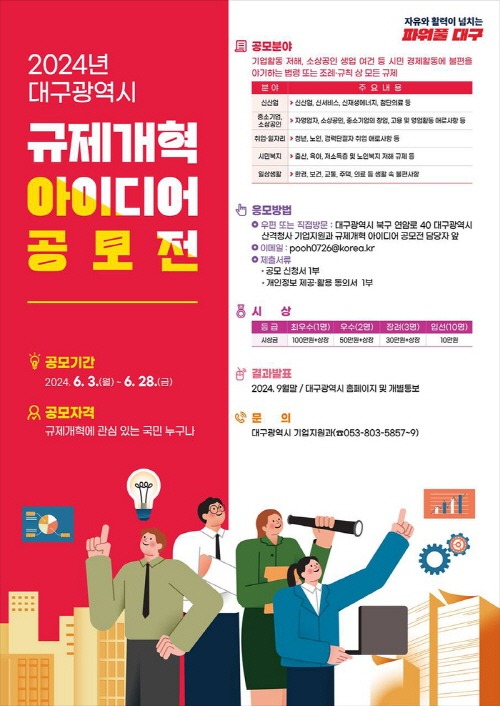 대구광역시는 경제활동과 일상생활에 불편을 주는 다양한 규제를 시민이 직접 제안하는 ‘2024년 대구광역시 규제개혁 아이디어 공모전’을 개최한다.