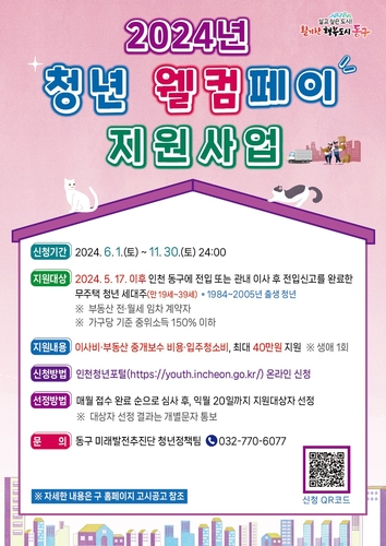 인천 동구는 올해부터 관내 전입 청년을 대상으로 이사비·부동산 중개보수 비용·입주청소비를 지원하는 '청년웰컴페이 지원사업'을 시행한다고 밝혔다.