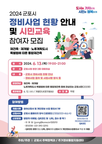 군포시는 정비사업(노후계획 도시정비, 재개발, 재건축, 리모델링, 소규모 정비)에 대해 군포시에서 추진 중에 있는 사업의 현황을 안내하고 시민교육을 진행해 정비사업에 대한 시민의 이해도를 높이고 정확한 정보 제공을 위해 '2024년 정비사업 현황 안내 및 시민교육'을 개최한다.